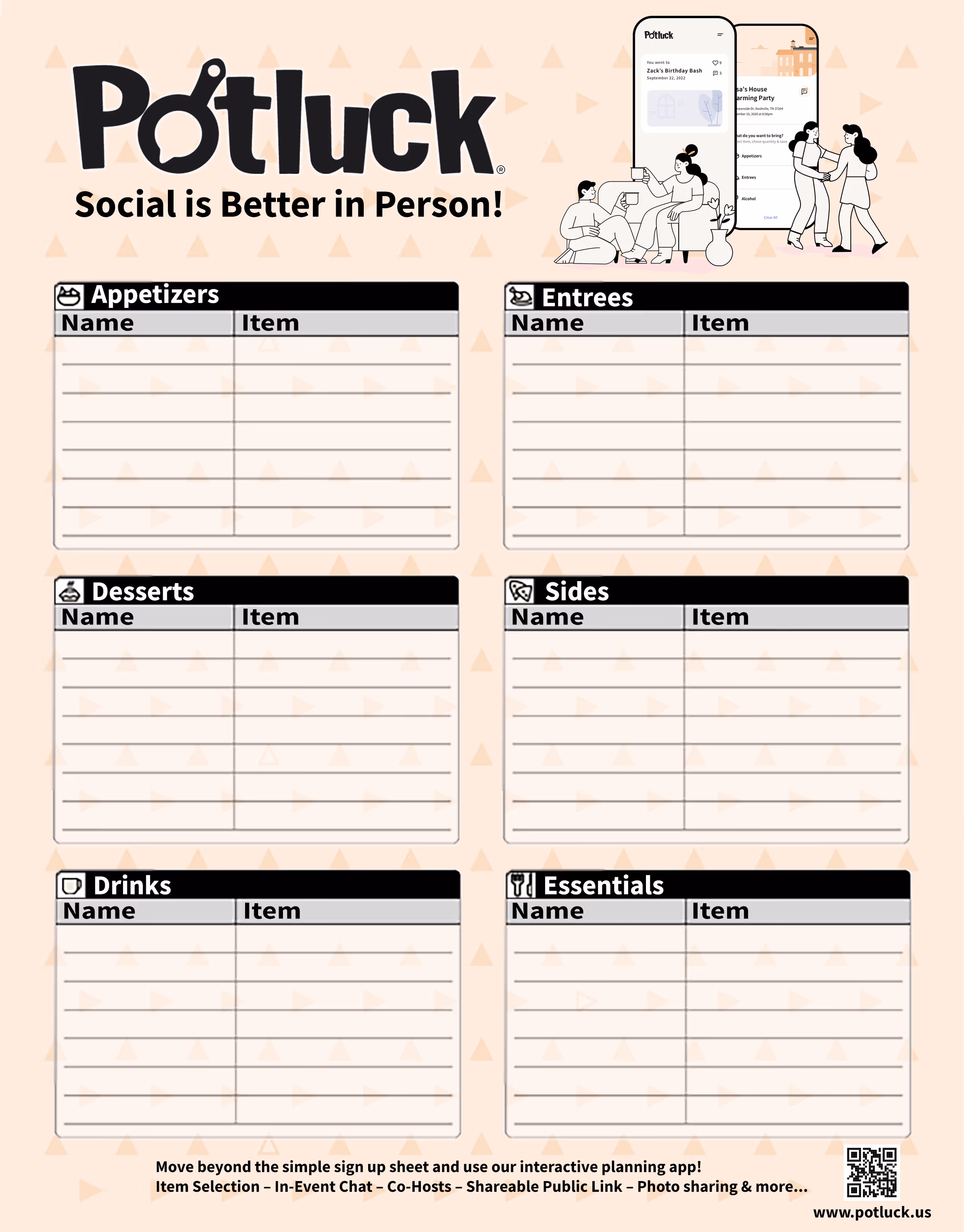 Our party planning app features item selection, in-event chat for guests, the ability to add co-hosts, photo uploads for guests, and more!